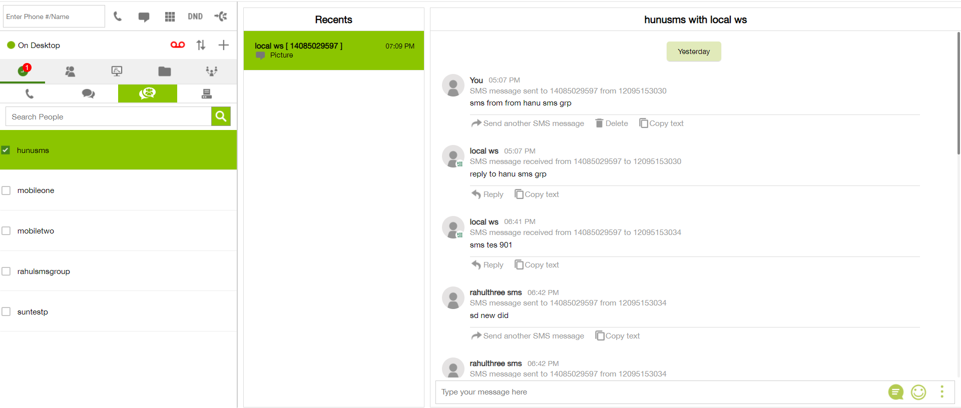 The SMS Group filter displays the SMS Groups you are part of, and you can respond to ANY incoming SMS chat that hits the SMS Group. Upon an incoming SMS to an SMS Group all members of the SMS Group will receive a notification that they have an unread message on the Recents icon.
